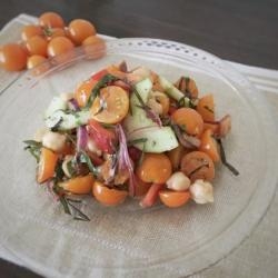 1. Place the cherry tomatoes, cucumbers, bell pepper, chickpeas, and red onions in a large bowl.