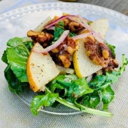 4. In a large bowl, mix together baby arugula, sliced red onion, toasted walnuts, sliced pear and vinaigrette. Serve and enjoy.